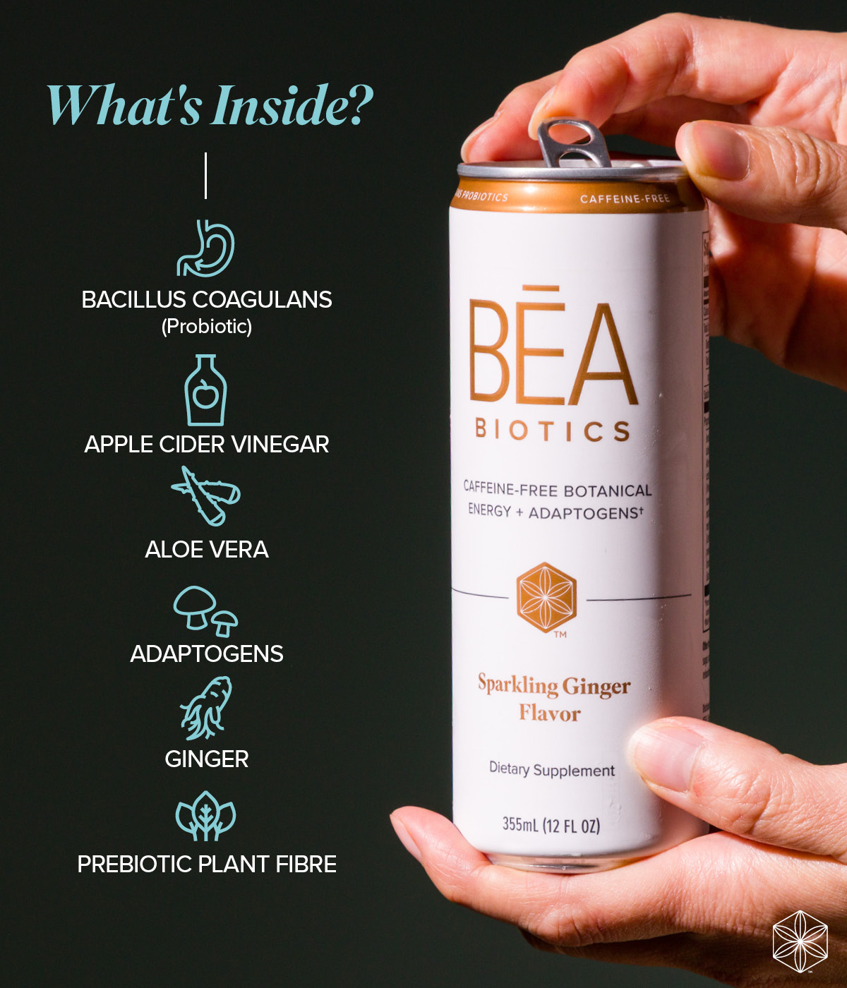 Enter BĒA Biotics. A delicious sparkling beverage packed with natural good-for-your-gut ingredients, like pre and probiotics, apple cider vinegar, soothing aloe vera and uplifting ginger.